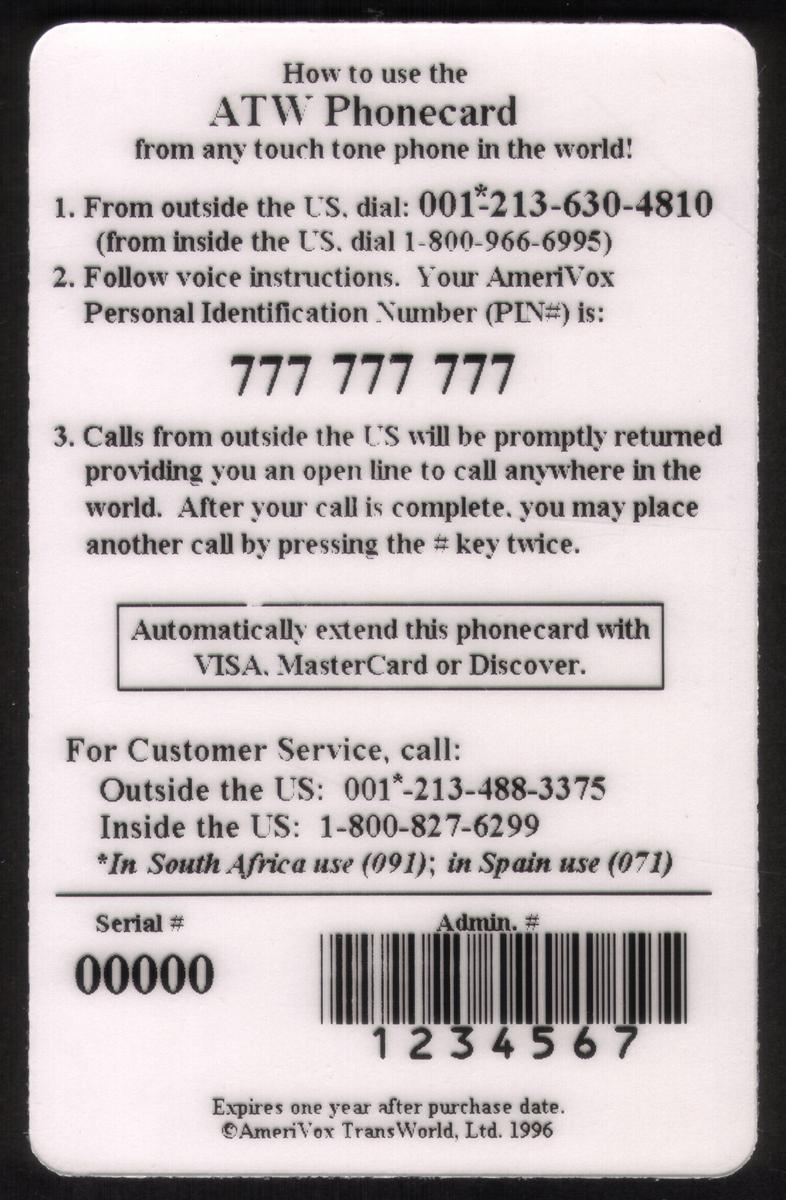 Since we have the world's largest inventory of USA phonecards for collectors, you will not necessarily receive the identical serial/batch/PIN number that we have scanned/pictured.