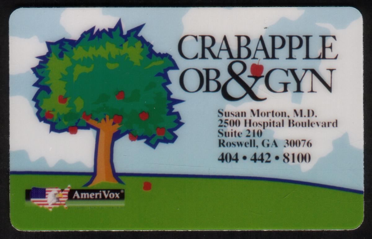 Overall, this collectible card represents a connection to obstetrics and gynecology through both textual and graphic elements, with clear identification of Dr. Susan Morton from Roswell, Georgia. The inclusion of apples and crab apples adds an artistic touch to the presentation, aligning with the theme of health and wellness.