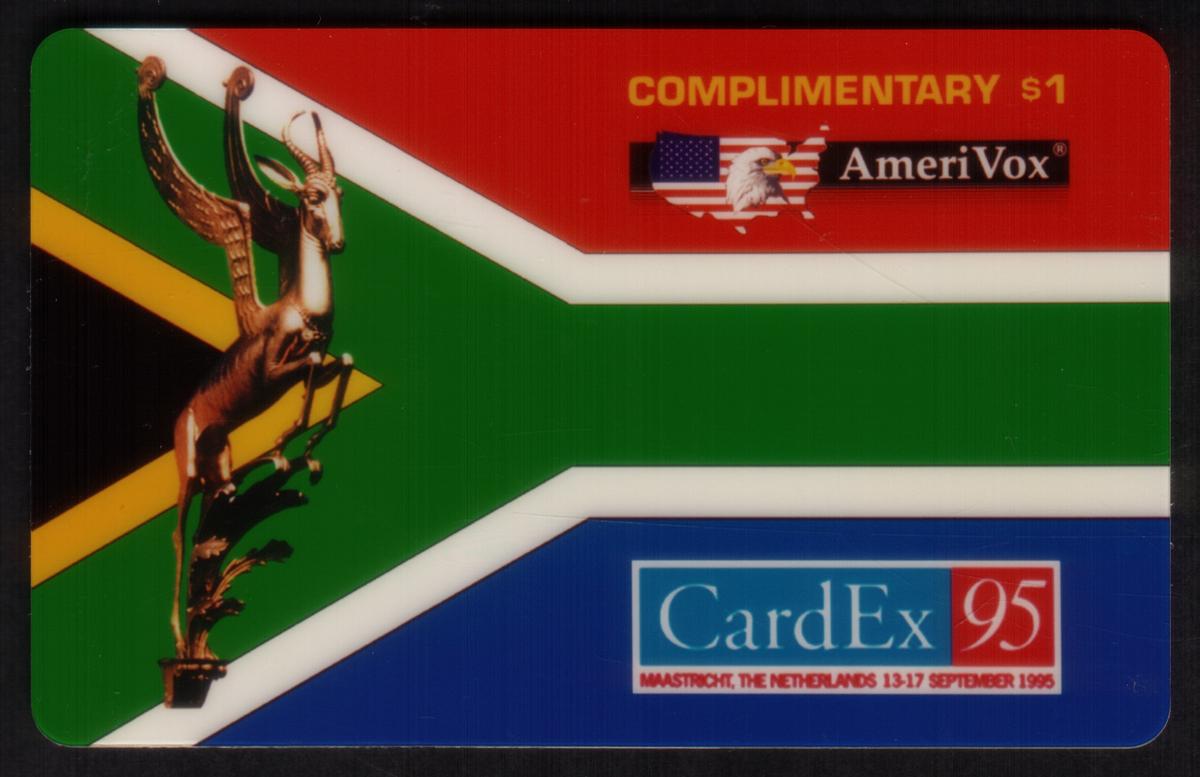 South African flag background with Golden Kudu, $1 value, AmeriVox logo, and CardEx 95 details from Maastricht 1995, blending culture, history, and collectibles. |