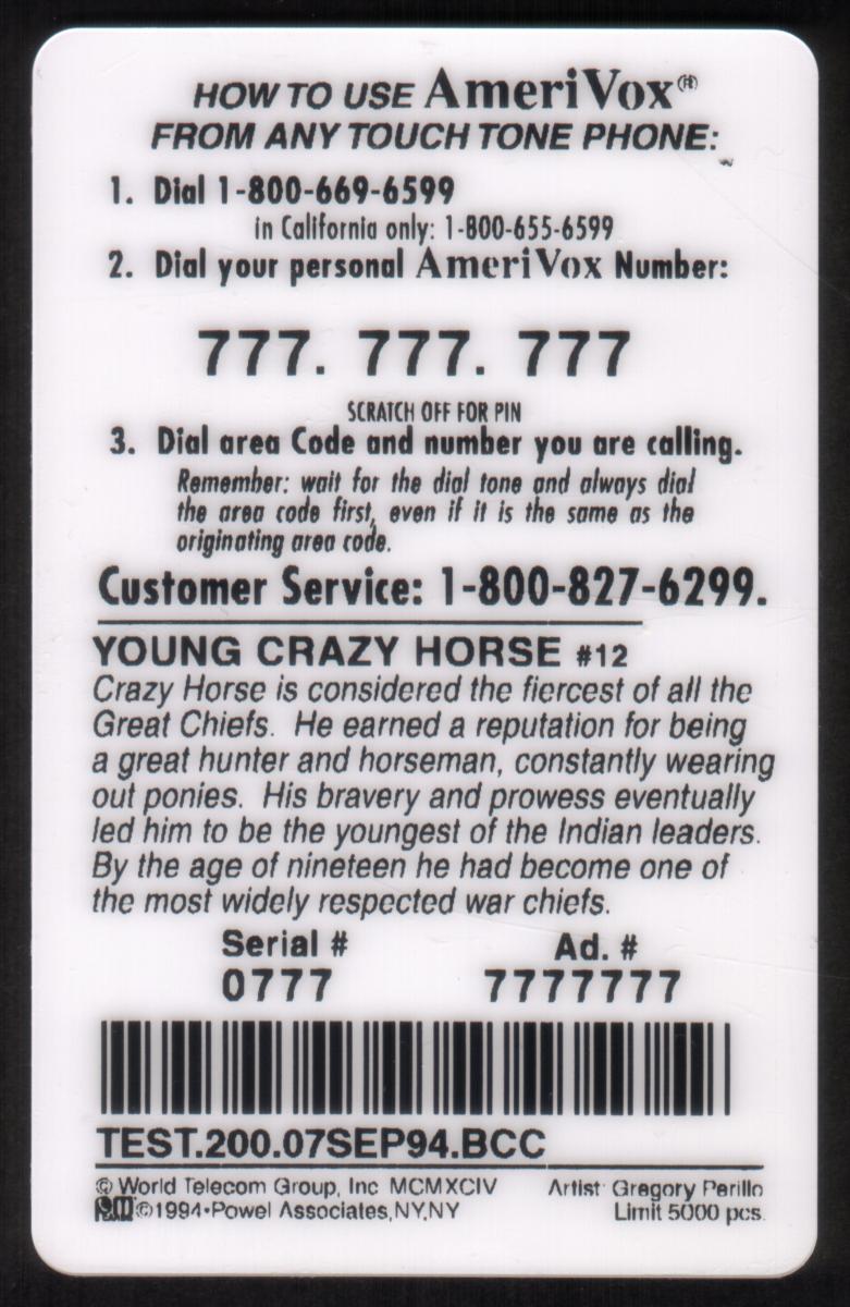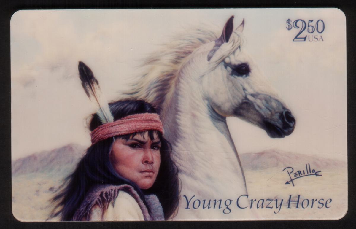 This collectible phone card features artwork titled "Young Crazy Horse" by Perillo. The detailed image shows a Native American youth with long dark hair, a red headband, and a feather tucked into it. The young figure exhibits a serious expression, embodying strength and determination. Beside him is a striking white horse with a flowing mane, its head turned to the side.