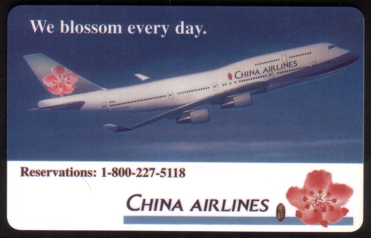 The bottom section of the card highlights the China Airlines name in bold, elegant font, accompanied on the right side by a vibrant plum blossom graphic, which echoes the design on the airplane’s tail. The card incorporates the MCI Communications logo discreetly near the lower right corner, indicating the card’s communication or sponsorship affiliation. This piece serves as both a promotional and collectible item representing China Airlines and its Boeing 747 model.