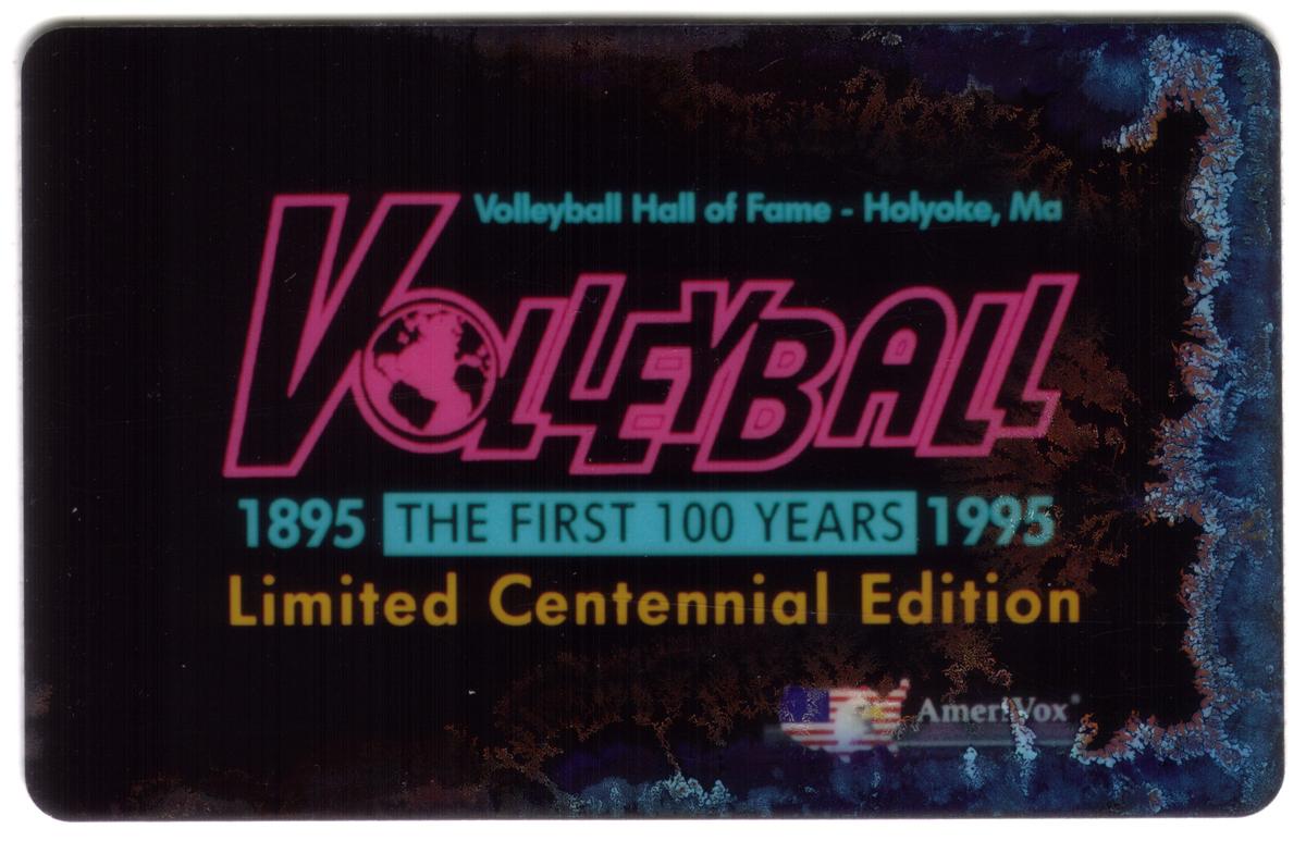 This collectible chip card commemorates the Volleyball Hall of Fame 100th Anniversary, marking the centennial period from 1895 to 1995. It features the title "Volleyball Hall of Fame 100th Anniv (Holyoke, MA)" prominently displayed on the front. The card emphasizes the theme of "the first 100 years" in volleyball history, celebrating a century of the sport. This edition is identified as a limited centennial edition and is marked as a proof card by AmeriVox.