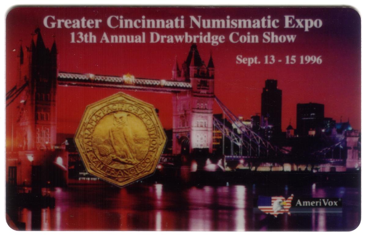 This card represents a significant piece for collectors interested in coins, numismatics, and currency, especially those focused on commemorative and event-related collectible items connected to major coin expos and the Cincinnati region. It connects themes of money, historic landmarks, and notable numismatic events from 1996.