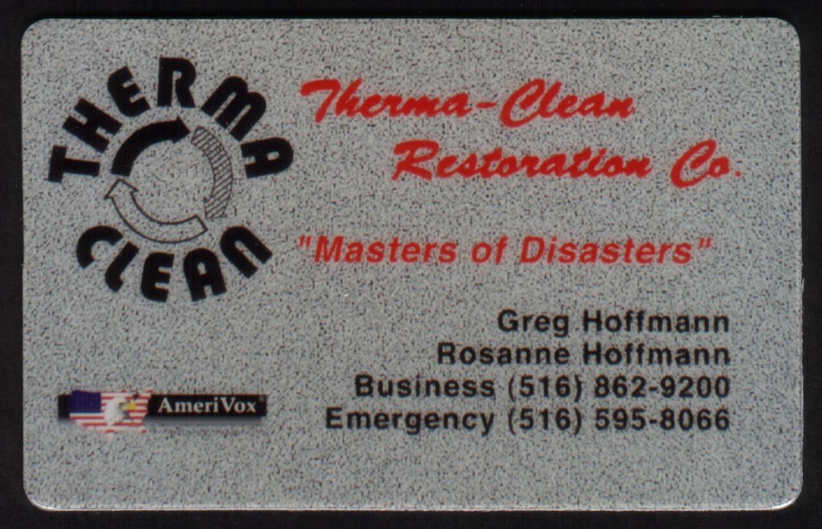This card serves as a corporate business promotional item associated with Therma-Clean Restoration Co. It highlights the company’s disaster restoration services through professional branding details and names related to the Hoffmanns, who are key representatives of the business.