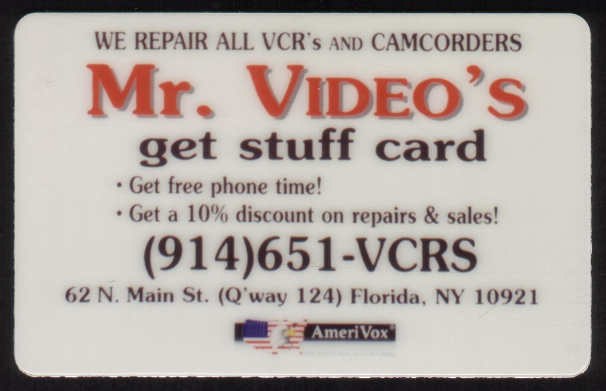 This collectible card is a Mr. Video’s Get Stuff Card featuring services for VCR and camcorder repairs. The card highlights repair offerings for all VCRs and camcorders, along with promotional benefits including free phone time and a 10% discount on repairs and sales. It prominently displays the phone number 914-651-VCRS, linking it to the Mr. Video’s service. The locations mentioned on the card include Florida and New York.