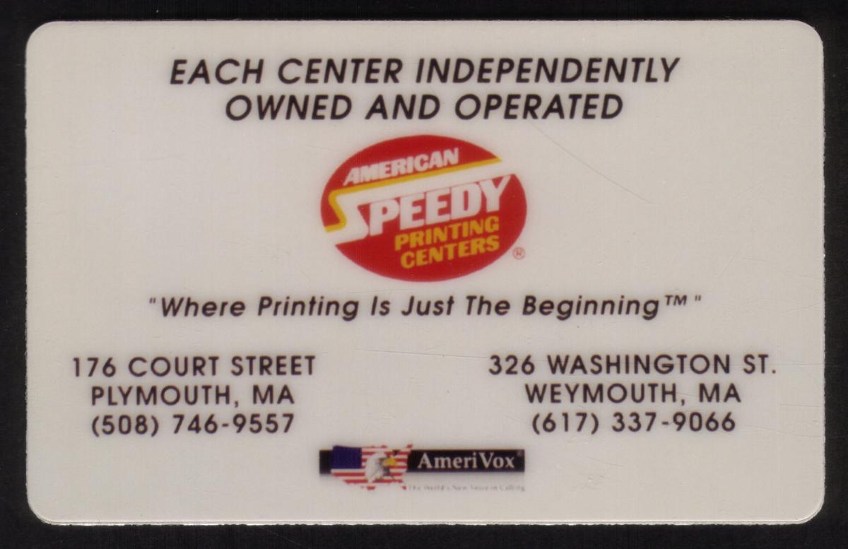 This phone card is a promotional item tied to American Speedy Printing Centers in Massachusetts. It serves as a collectible piece that highlights the company’s local presence and emphasizes the individual ownership model of each printing center. The overall presentation is professional and corporate, aimed at representing the printing service business across the state's Plymouth and Weymouth areas.