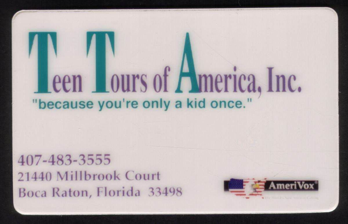 This collectible card is associated with the travel and tourism industry and is connected to the brand Teen Tours of America and AmeriVox. It serves as a promotional item rather than a payment or phone card. The card reflects a focus on youth travel experiences, supporting tour operators and travel agents in Boca Raton, Florida.