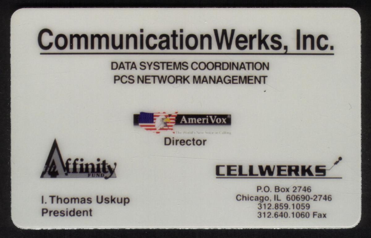 This collectible phone card features detailed graphics related to Communication Werks Inc., a company based in Chicago, Illinois. The card prominently displays the Communication Werks Inc. logo, along with the names "Cellwerks" and "AmeriVox," linking the card directly to these telecommunications entities. The name I. Thomas Uskup is featured, identified as the President, while the name AmeriVox appears again with the title "Director," providing key leadership references associated with the card. The card also includes the terms "data systems coordination," "pcs network management," and "affinity fund," emphasizing its connection to telecommunications and network services.
