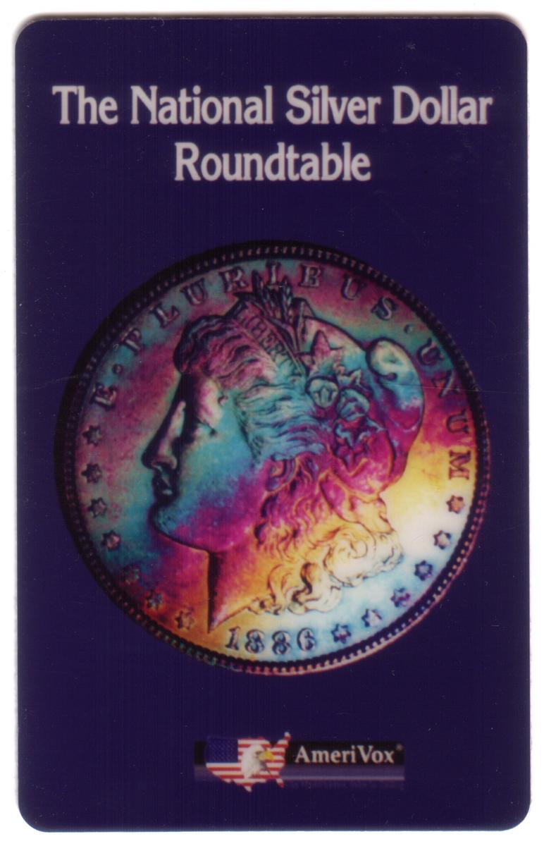 The card’s background is light-toned and contrasts well against the detailed image of the silver dollar coin. The card’s edges are white, framing the design cleanly. The card uses sharp typography that clearly identifies the coin and its attributes without any additional unrelated imagery or symbols. This collectible phone card serves as a tribute to the Carson City King silver dollar and The National Silver Dollar Roundtable’s 1995 commemorative issue.