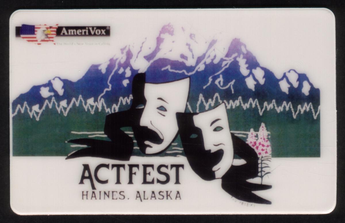 This is a collectible item related to the event Actfest in Haines, Alaska, combining themes of acting, scenery, and regional landscape. It does not display any numeric value or identifiers typical of a phone or bank card, focusing instead on commemorating theatrical performance and the Alaskan environment.