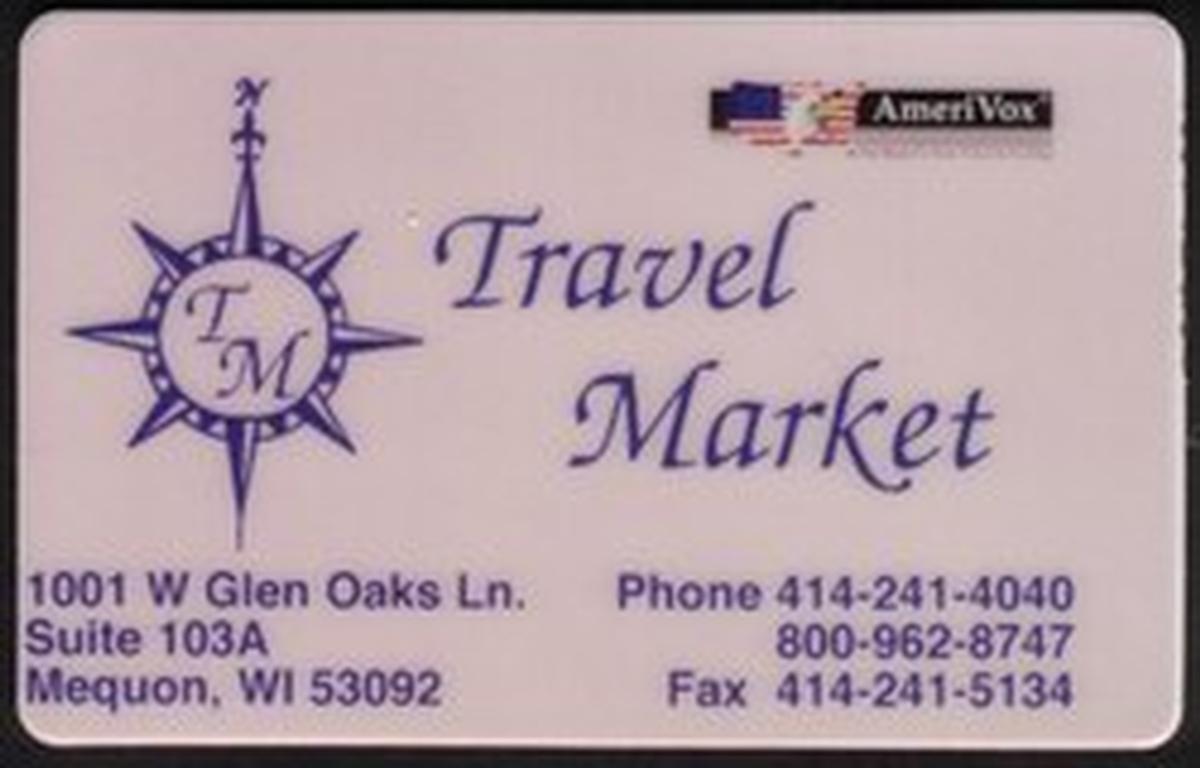 This collectible chip card features the logo and branding of Travel Market, a company serving travel professionals and travel advisors. The card prominently displays contact phone numbers, including 414-241-4040 and 800-962-8747. The location is identified as Mequon, Wisconsin, which likely refers to the company’s base of operations or service area.