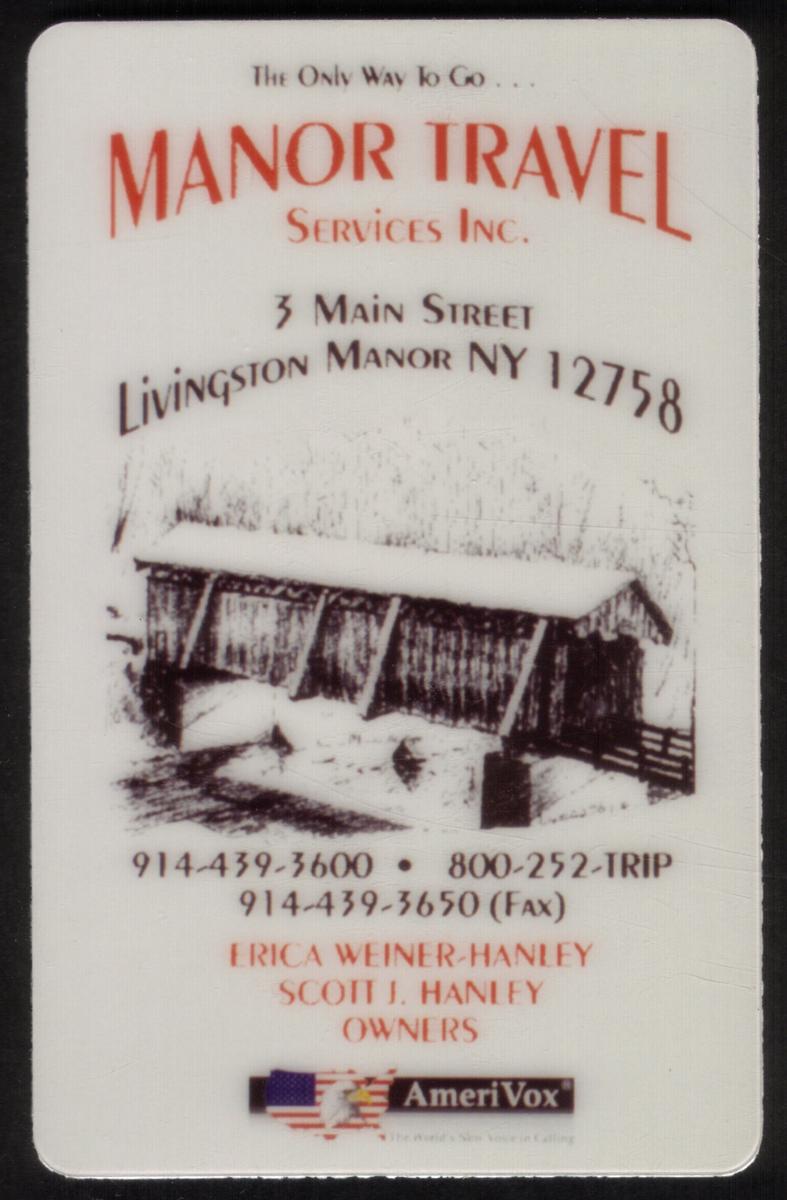 Along the bottom right of the card is a small logo and text reading "PROOF — AmeriVox," indicating the printer or issuer related to the card's production. The card also bears the text "Promotionals" and identifies the association with travel agencies and travel advisors. The branding "Manor Travel (Travel Professionals)" reinforces the travel-service theme of the card. The overall design aligns with promotional materials aimed at travel clients and advisors, emphasizing the services offered by Manor Travel Service Inc.