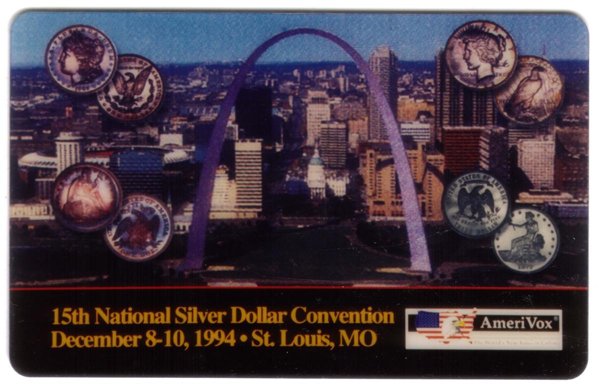 The card’s design, colors, and imagery emphasize its role as a promotional item for the 15th National Silver Dollar Convention held in St. Louis in December 1994. It is linked to the themes of coin collecting and silver coin promotion, representing an important event for collectors and enthusiasts of numismatics. The card's layout and clear text serve both an informative and commemorative purpose.