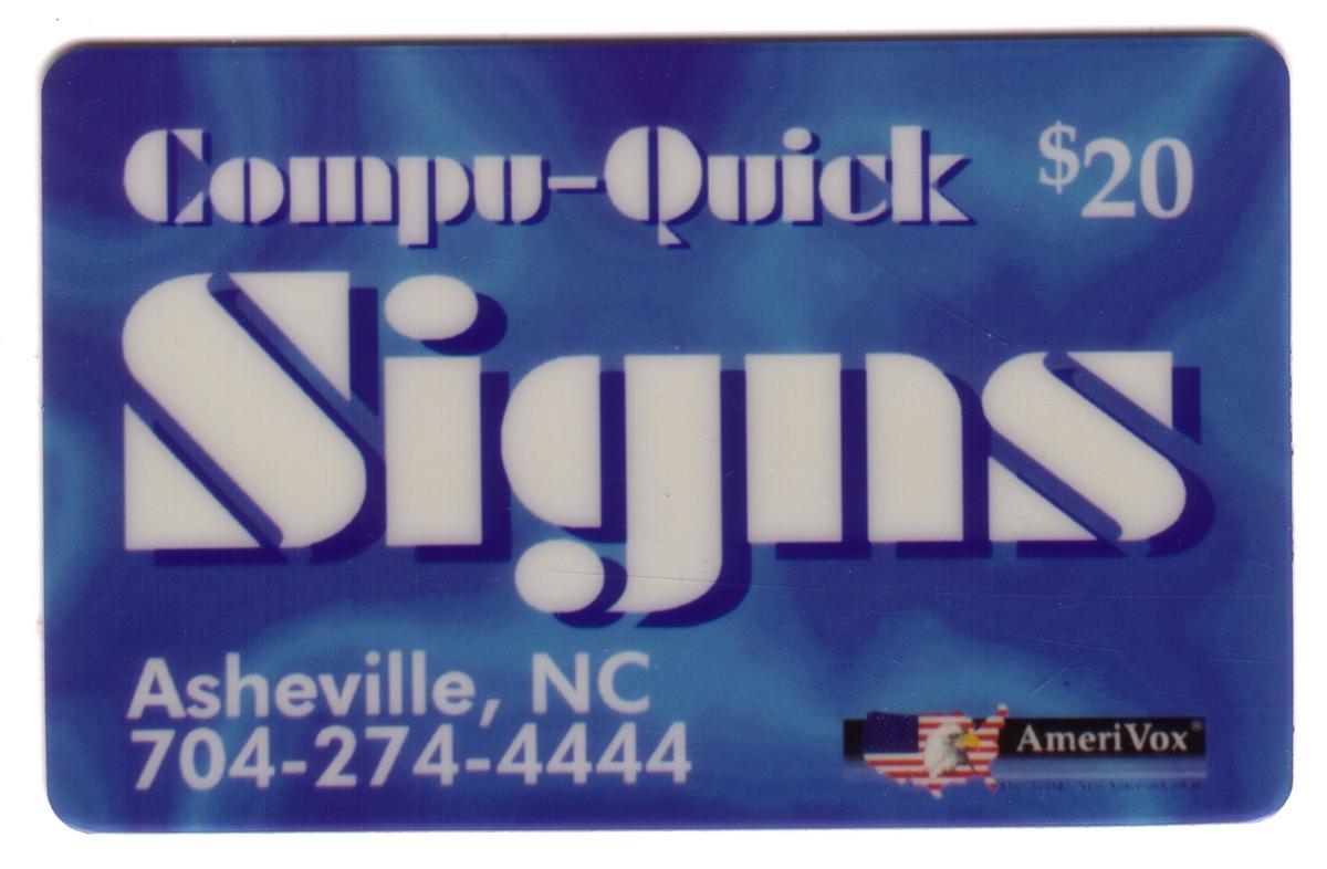 Additional text on the card includes “Compu-Quick Signs - Asheville, North Carolina PROOF - AmeriVox,” which indicates the card itself is associated with AmeriVox and serves as a proof related to Compu Quick Signs. The card is blank on the reverse side and marked with a value of $20, as printed on the front. The card’s visual presentation connects it to printing and signage services offered in Asheville.