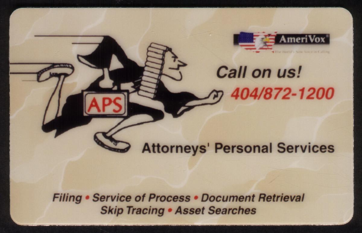 This collectible chip card features the professional services of Attorneys' Personal Services (APS) based in Atlanta, Georgia. The card highlights the firm’s expertise in legal support services including filing, service of process, process serving, document retrieval, skip tracing, and asset searches. The company slogan "Call On Us" is prominently displayed along with the name AmeriVox, indicating a connection to the AmeriVox network or brand.