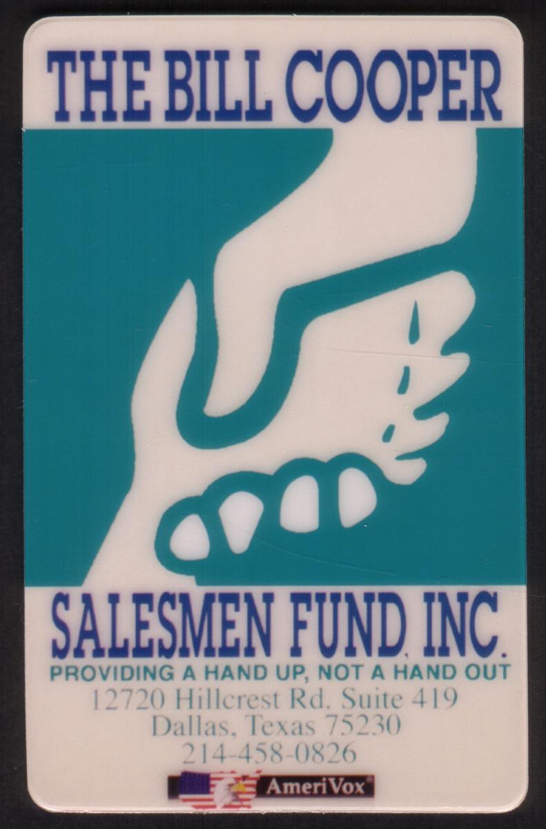This collectible chip card features the logo and name of The Bill Cooper Salesmen Fund Inc, a Dallas, Texas organization. The card is marked with the word "PROOF" and the name AmeriVox, indicating its connection to this issuer or producer. The card also includes the phrase "providing a hand up, not a hand out," emphasizing the mission or values of The Bill Cooper Salesmen Fund Inc.