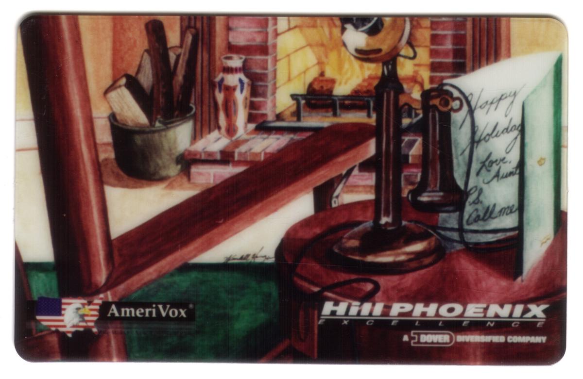 Overall, this collectible phone card merges vintage imagery with holiday sentiments and corporate branding. The detailed rendering of the old telephone alongside the fireplace creates a warm and inviting mood. The presence of “Dover Diversified Company,” “Hill Phoenix,” and “Excellence Refrigeration” emphasize the business affiliations related to the card. The “Happy Holidays Love Aunt” message and “PS Call Me” inscription personalize the card while reinforcing the theme of communication.