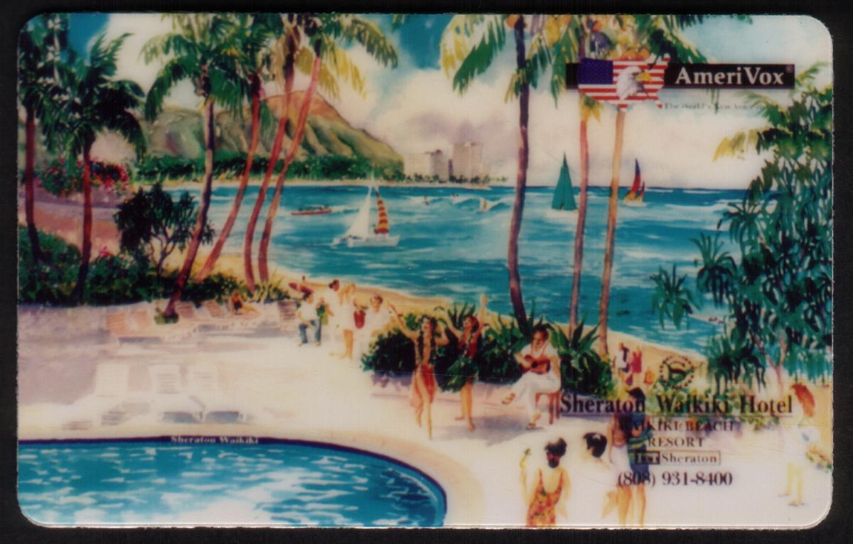 This collectible phone card features a vibrant artistic depiction of the Sheraton Waikiki Beach Resort in Hawaii. The image highlights a scenic beach scene with palm trees and a clear blue sky framing the resort buildings in the background. In the foreground, a group of people dressed in traditional Hawaiian attire are shown dancing; one person plays a guitar while others wear leis and swimsuits, emphasizing the island’s cultural music and dance. The presence of brightly colored sailboats on the water and distant mountains completes the tropical setting.