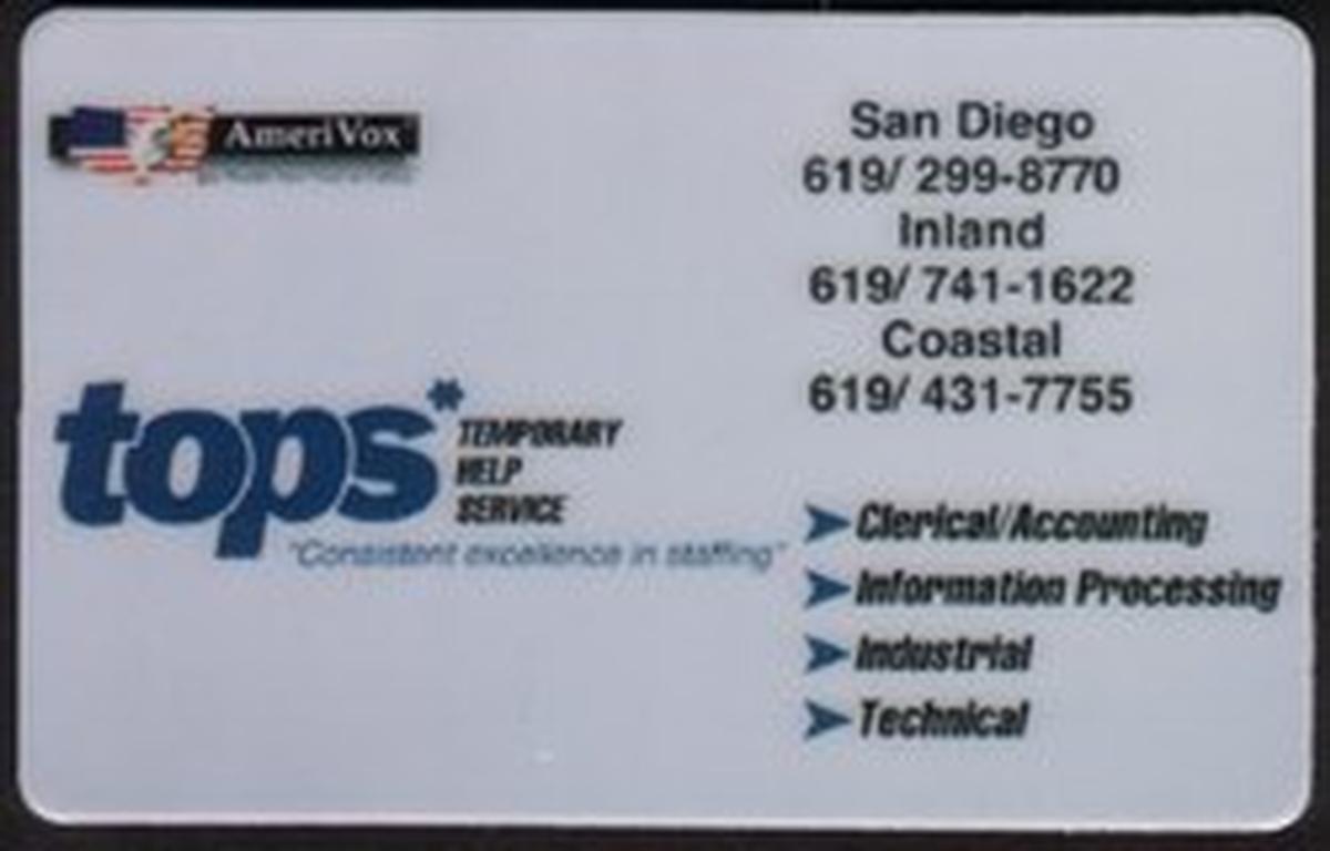 This card serves as both a collectible item and a functional promotional tool for those seeking temporary help services in multiple job sectors within San Diego. It combines practical contact information with branding elements to present TOPS as a resource for efficient and dependable staffing solutions.