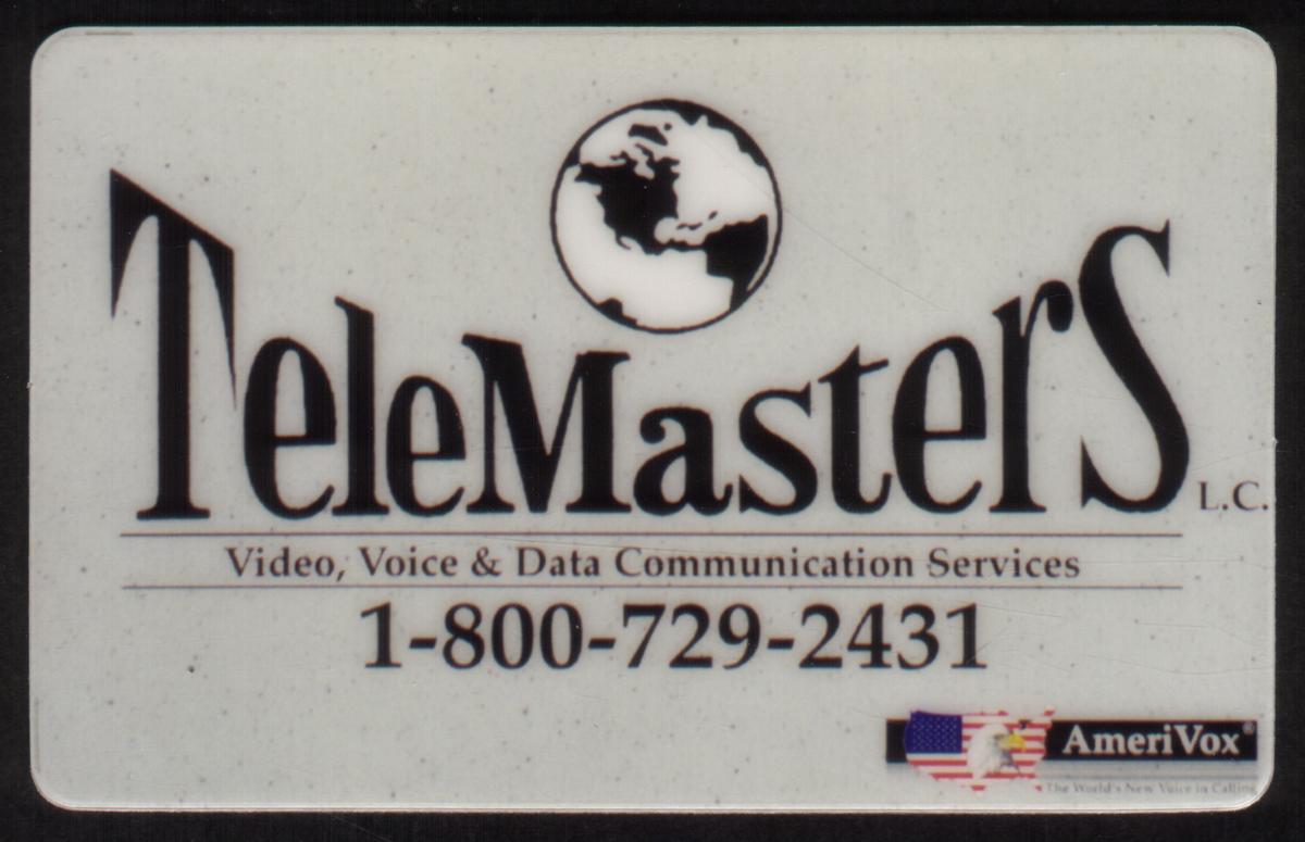 This item exemplifies a collectible telecommunications chip card, issued and associated with WorldCom, reflecting its use in communication technology sectors. The combination of logos and text clearly identifies the card’s role in data and voice communications, making it a distinct and factual representation of TeleMasters’ service offerings.