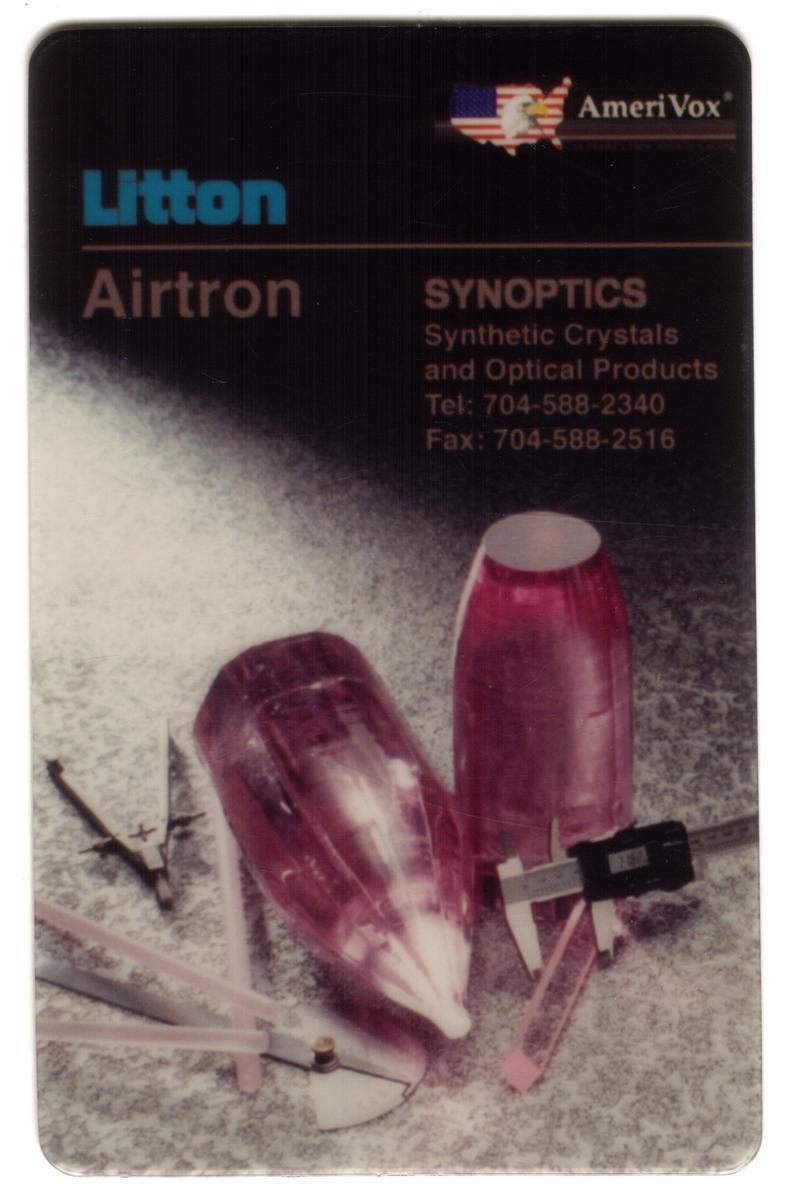 Additional text on the card identifies “Litton Airtron Synoptics: Synthetic Crystals & Optical Products," indicating a connection to optical and synthetic crystal technologies. The word "PROOF" is printed on the card, confirming its status as a special or sample issue. The AmeriVox name appears as well, suggesting involvement with the production or distribution of the card.
