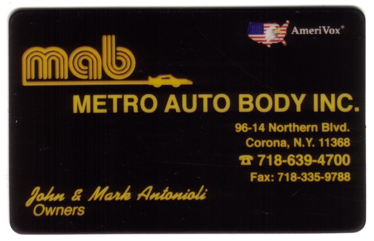This collectible automotive business card features the branding of Metro Auto Body (MAB), prominently displaying the names John & Mark Antonioli. The card includes the automotive theme and is directly connected to automotive services and repair. Contact information on the card lists a phone number: 718-639-4700. The location associated with Metro Auto Body is Corona, New York, clearly stated on the card.