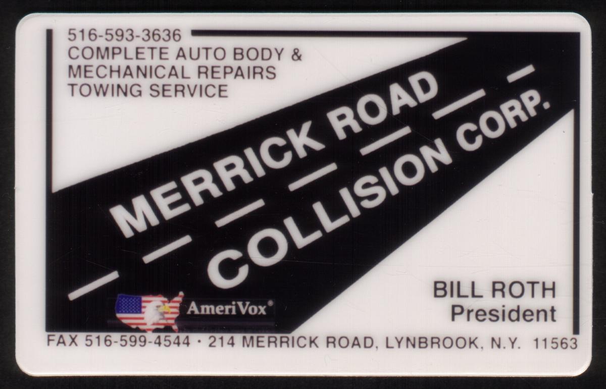 This collectible corporate business card is for Merrick Road Collision Corp., specializing in complete auto body and mechanical repairs as well as towing services. The card prominently features the name Bill Roth as president. The business is located in Lynbrook, New York. Contact information includes the phone number 516-593-3636. The design conveys a professional automotive service identity.