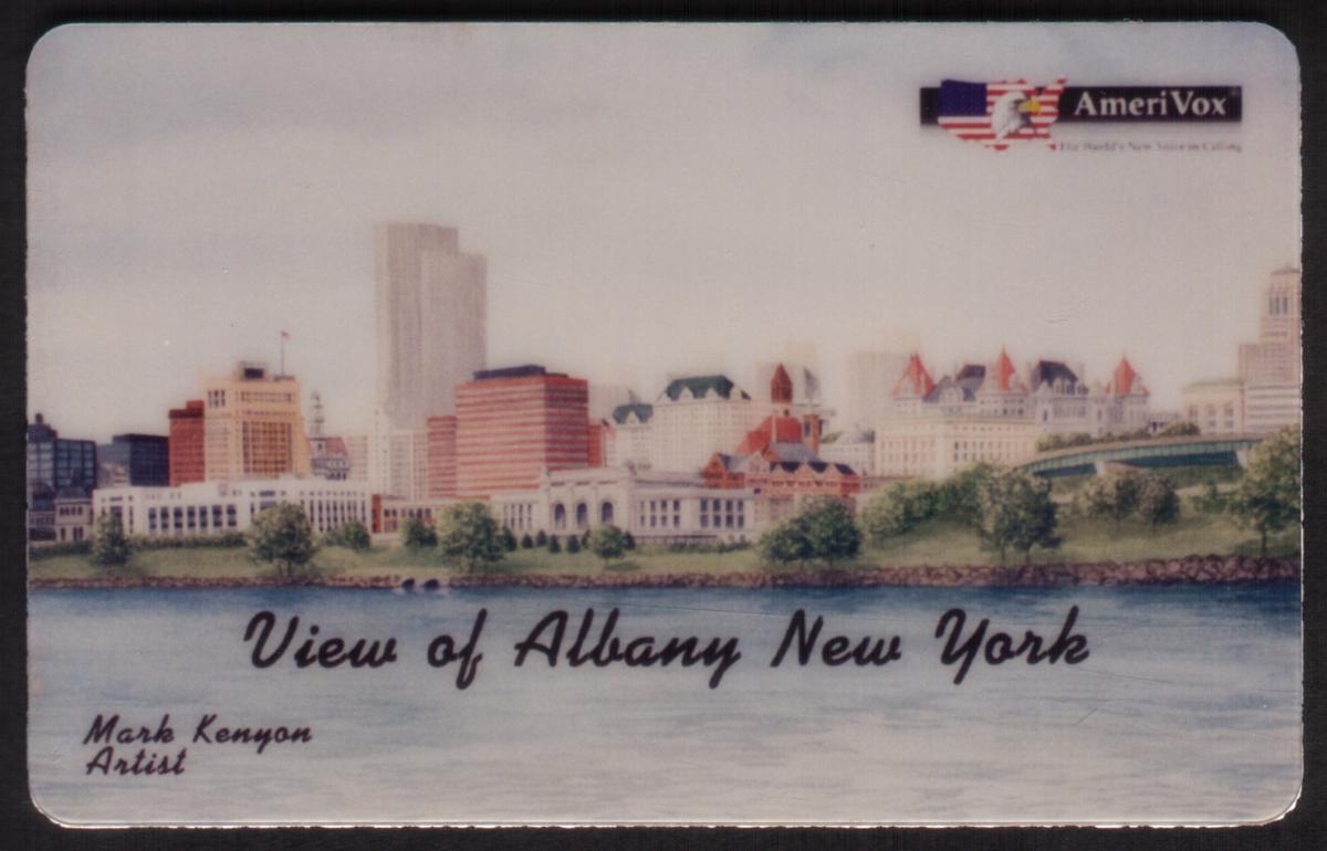 Overall, this card highlights the architectural beauty and distinctive skyline of Albany, New York, through the artistic interpretation of Mark Kenyon, making it a collectible item for those interested in cityscapes and American state capitals.
