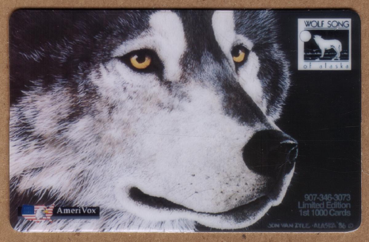 The card is titled "Wolf Song of Alaska" and is dated 1994. It is issued as a 5-minute phone card with a value of 5M. The issuing entity is AmeriVox. The text includes "Jon Van Zyle" and "5m Wolf Song of Alaska (1994)" clearly printed on the front, along with the designation "Gray Wolf PROOF." The overall design uses a clean layout that highlights the photographic art by Jon Van Zyle, emphasizing the wildlife theme centered on the grey wolf.