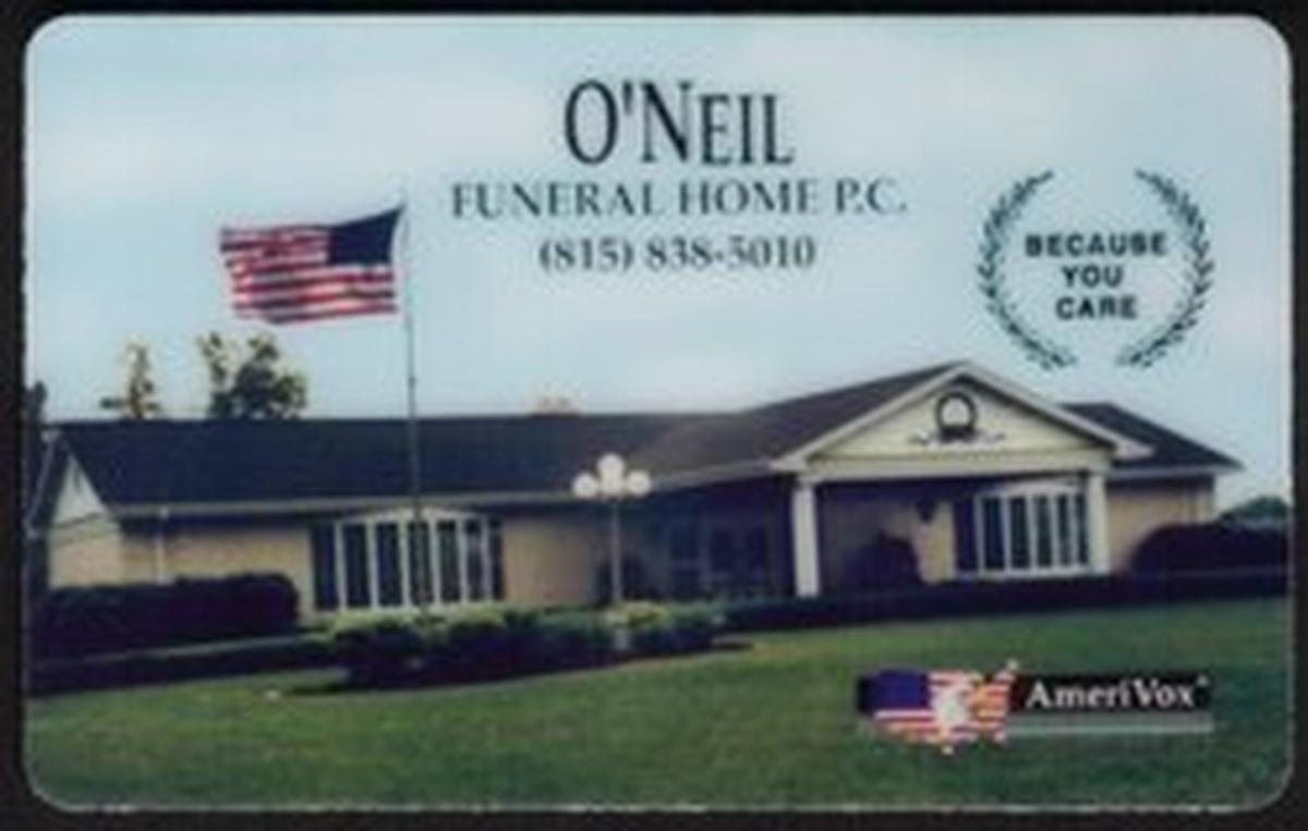 This collectible phone card features the branding and contact information for O'Neil Funeral Home PC, located in Lockport, Illinois. The card visually emphasizes a full-service funeral home offering funeral services. A prominent American flag is displayed, symbolizing respect and honor, which aligns with the nature of the business. The phrase "Because You Care" is printed on the card, reinforcing the compassionate approach of the funeral home.