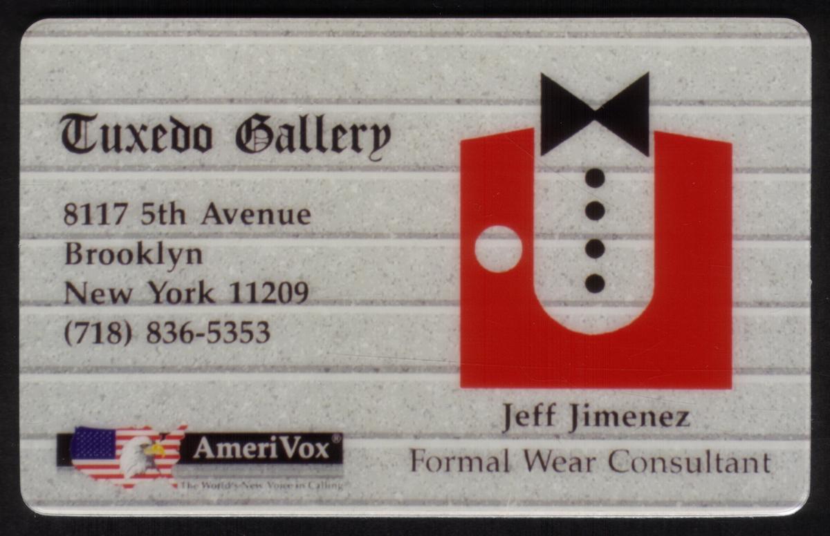 The card also includes logos of various tuxedo and formal wear brands arranged in a row near the bottom. The logos are clear and distinct, emphasizing the card’s professional and business-related theme. Additionally, the word “PROOF” appears on the card along with the name “AmeriVox,” which may represent the issuing or printing company associated with this card. The overall design is stark and businesslike, focusing on promoting Jeff Jimenez’s role as a formal wear consultant.