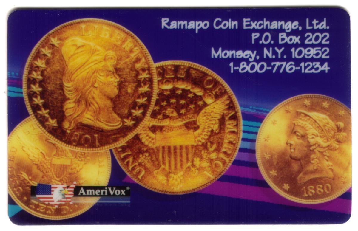 Additional text on the card references “Gold Coins” and "Currency", emphasizing its focus on coin collecting. The AmeriVox name ties the card to a promotional campaign or business communication, likely connected to the coin exchange in New York. The card serves both as a collectible and a promotional asset within the sector of gold coins and money collections.