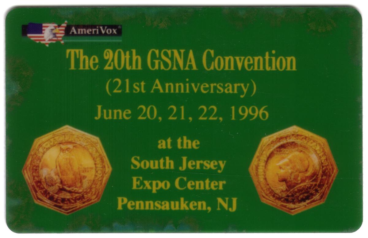 Overall, the card serves as a collectible numismatic piece commemorating the GSNA Convention event and the specific theme of gold currency or coinage associated with the Carson City mint and the AmeriVox line of collectibles. It is a piece that ties together coin collecting, convention memorabilia, and specific geographical and organizational references related to numismatics.