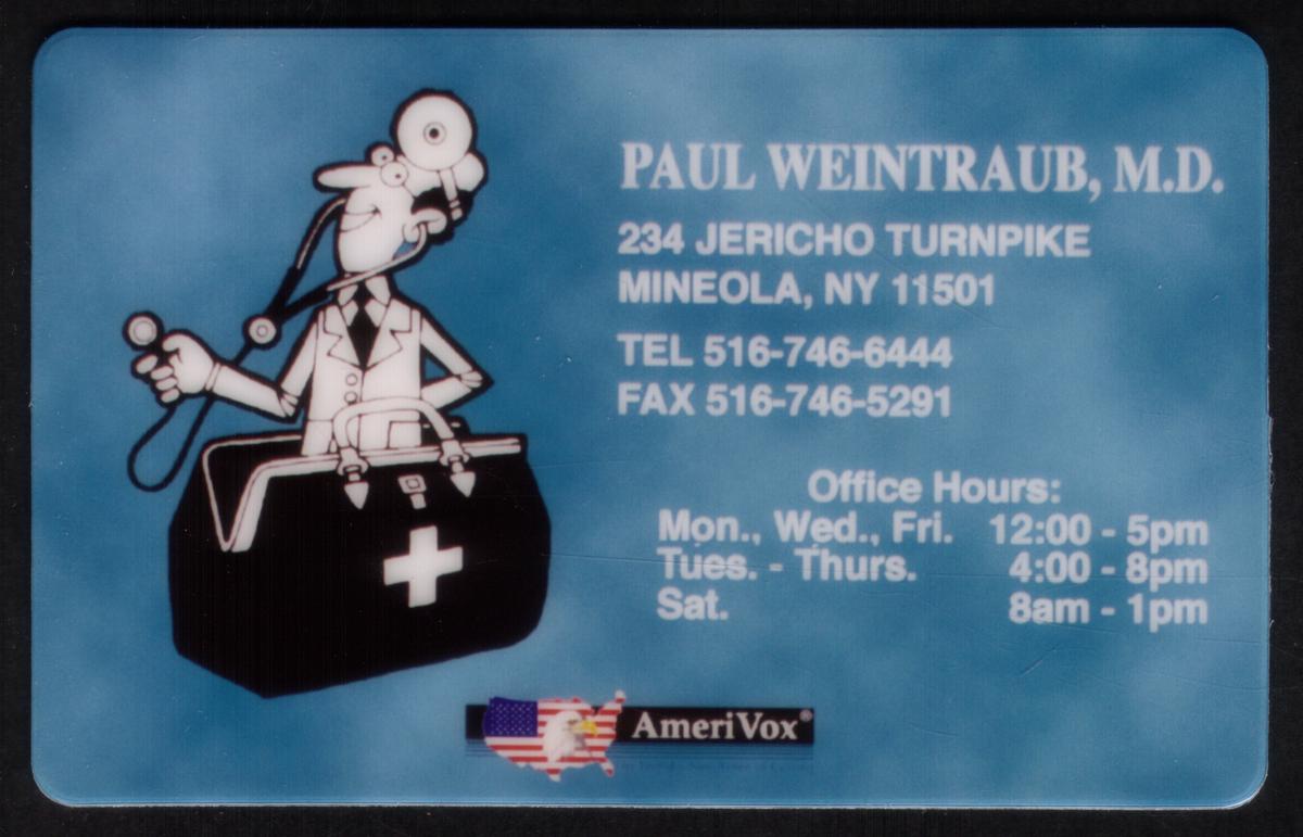 Overall, this card presents a visual and textual representation of a medical doctor’s corporate business card linked to Paul Weintraub, MD, highlighting internal medicine services in Mineola, New York, with elements symbolizing the healthcare industry.