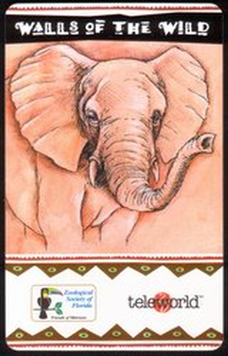 This collectible phone card features a close-up photograph of an elephant from the "Walls of The Wild" series by the Zoological Society of Florida. The image showcases the elephant's head and trunk in detail with textured skin and visible tusks. The photograph captures the natural appearance of the elephant, highlighting its large ears and peaceful expression.