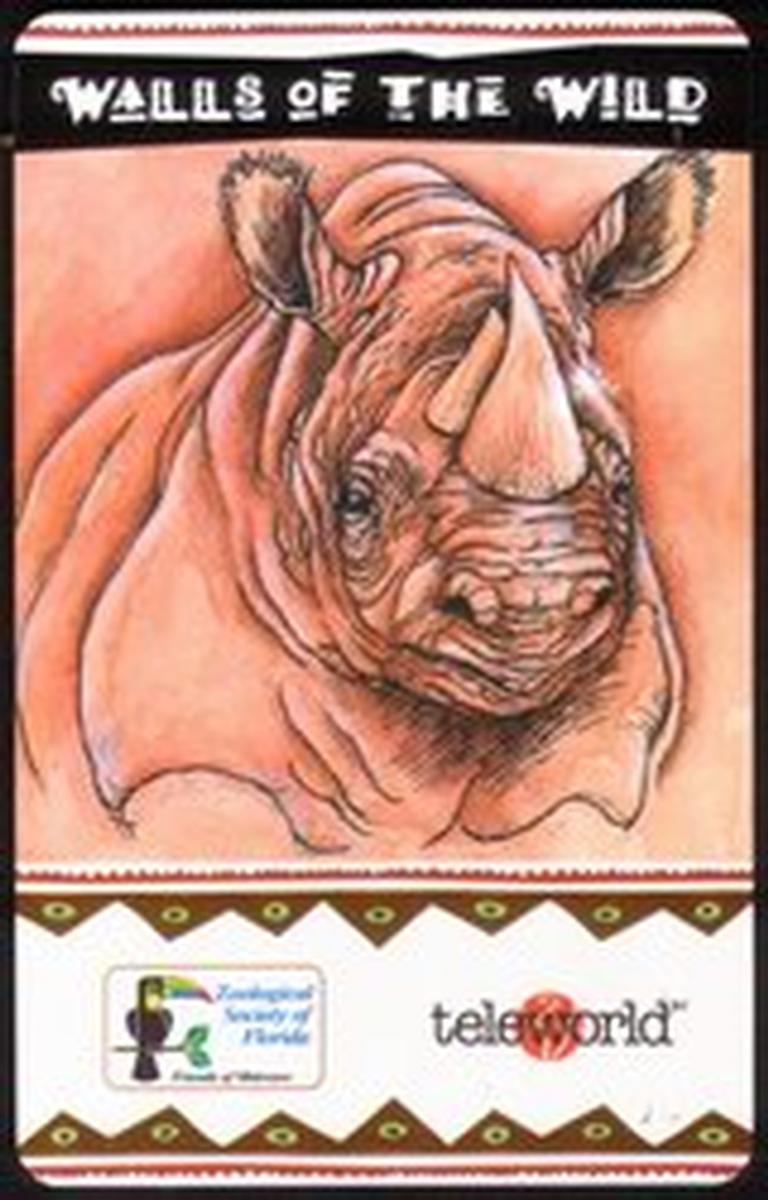 Additional markings on the card include the Teleworld Internat'l branding, ensuring its identification as a collectible phone card issued in support of wild animal conservation efforts linked to the Miami MetroZoo. The overall presentation reflects a wildlife awareness theme centered on the rhinoceros, with institutional affiliations clearly visible.