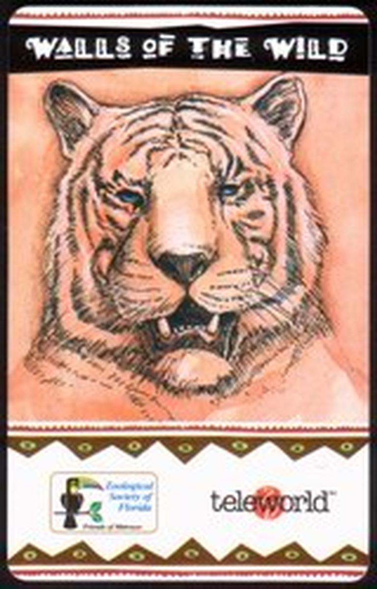 This collectible phone card from Friends of Metrozoo in Miami, Florida, features a striking image of a tiger, an animal symbolizing the wild. The tiger is set against a naturalistic backdrop, capturing the essence of wildlife and the mission of the Zoological Society of Florida. The card highlights the "Walls of The Wild" theme, emphasizing the connection between animal habitats and conservation efforts.