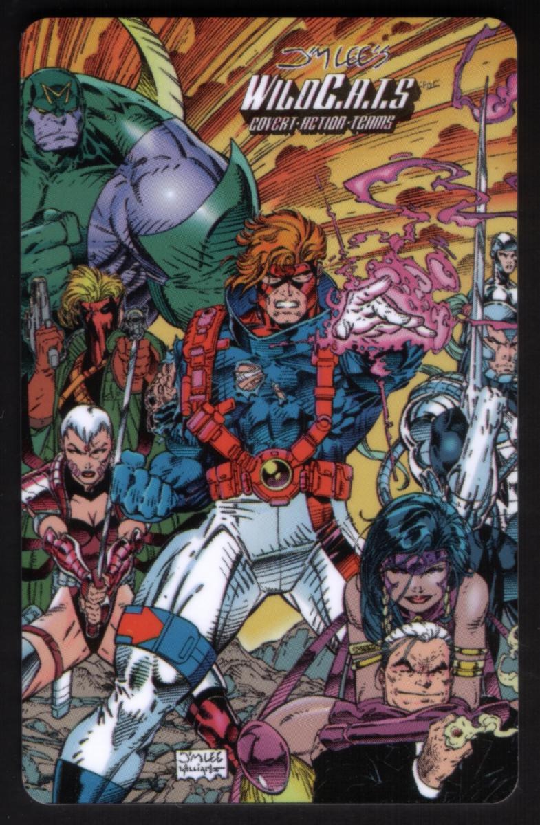 This collectible phone card features artwork from the WildC.A.T.S. comics series, specifically showcasing characters from Jim Lee’s WildC.A.T.S. Covert Action Team. The image prominently includes three characters rendered in a detailed and dynamic comic art style, consistent with Jim Lee’s signature approach to superhero illustrations. The characters are depicted in action poses, wearing stylized costumes that blend futuristic armor and tactical gear with superhero aesthetics.
