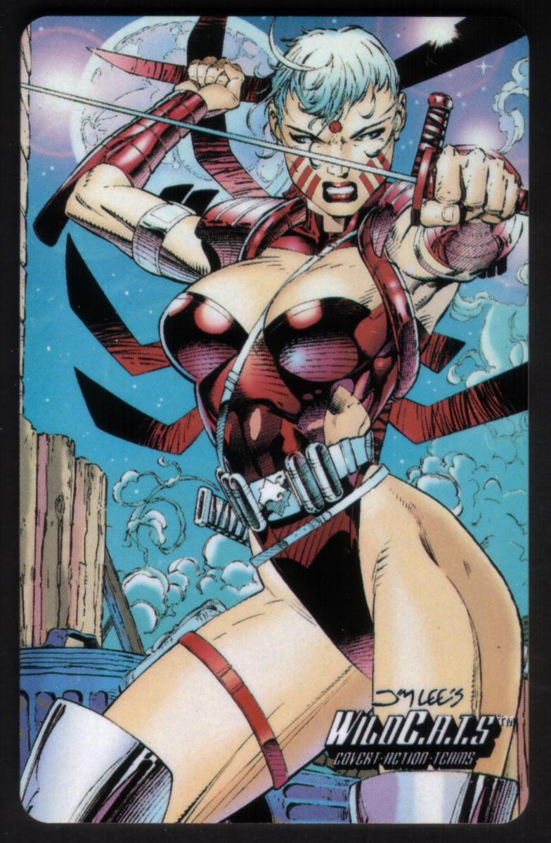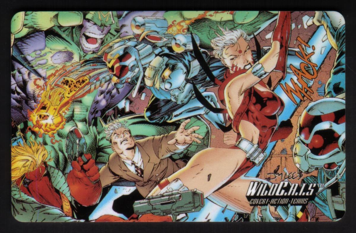 These six collectible phone cards feature artwork from Jim Lee’s WILD C.A.T.S. Comics Covert-Action-Teams, produced by Aegis Entertainment and Wildstorm Productions. Each card presents detailed, dynamic illustrations that showcase characters from the WILD C.A.T.S. series, known for its superhero and fantasy themes.