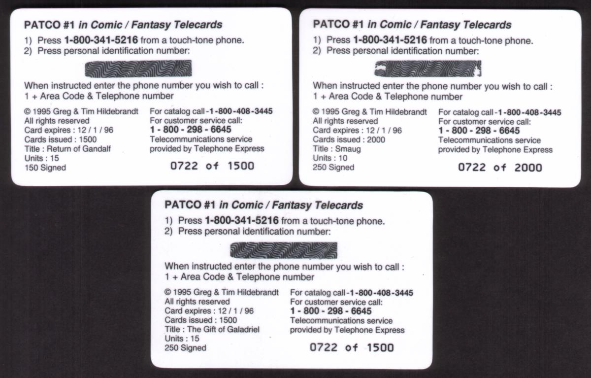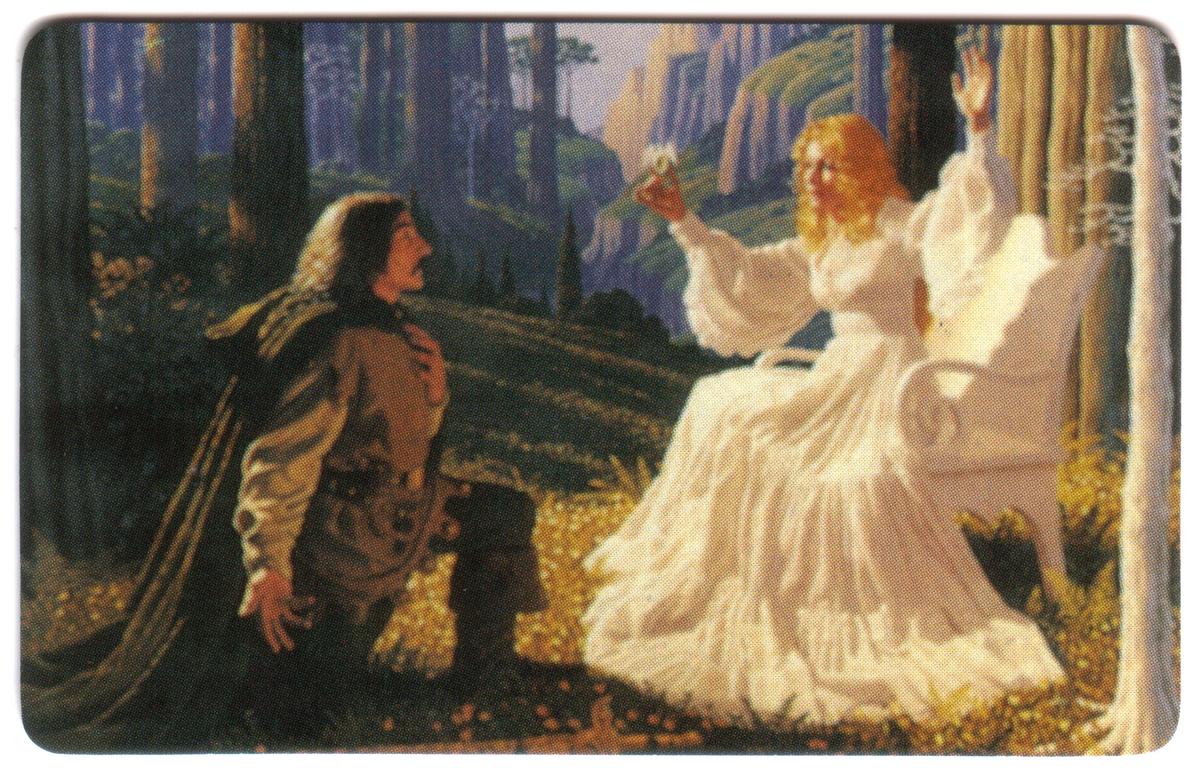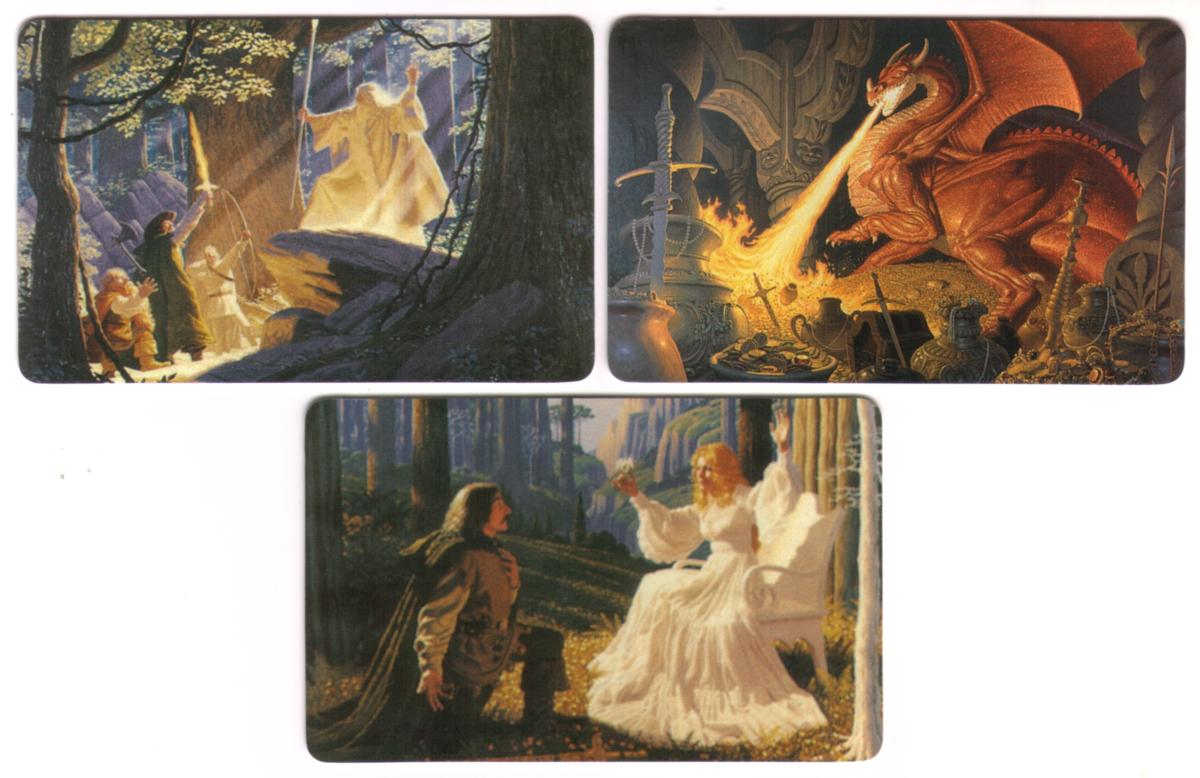 This complete set of three collectible phone cards features fantasy artwork by Greg and Tim Hildebrandt, well-known for their contributions to Tolkien-inspired art. Each card captures a distinct and detailed scene from "The Lord of the Rings." The first card shows a man kneeling before a woman in a long, flowing white dress seated in a forest setting, with tall trees and sunlight casting long shadows. The man wears a dark cloak and medieval-style clothing.