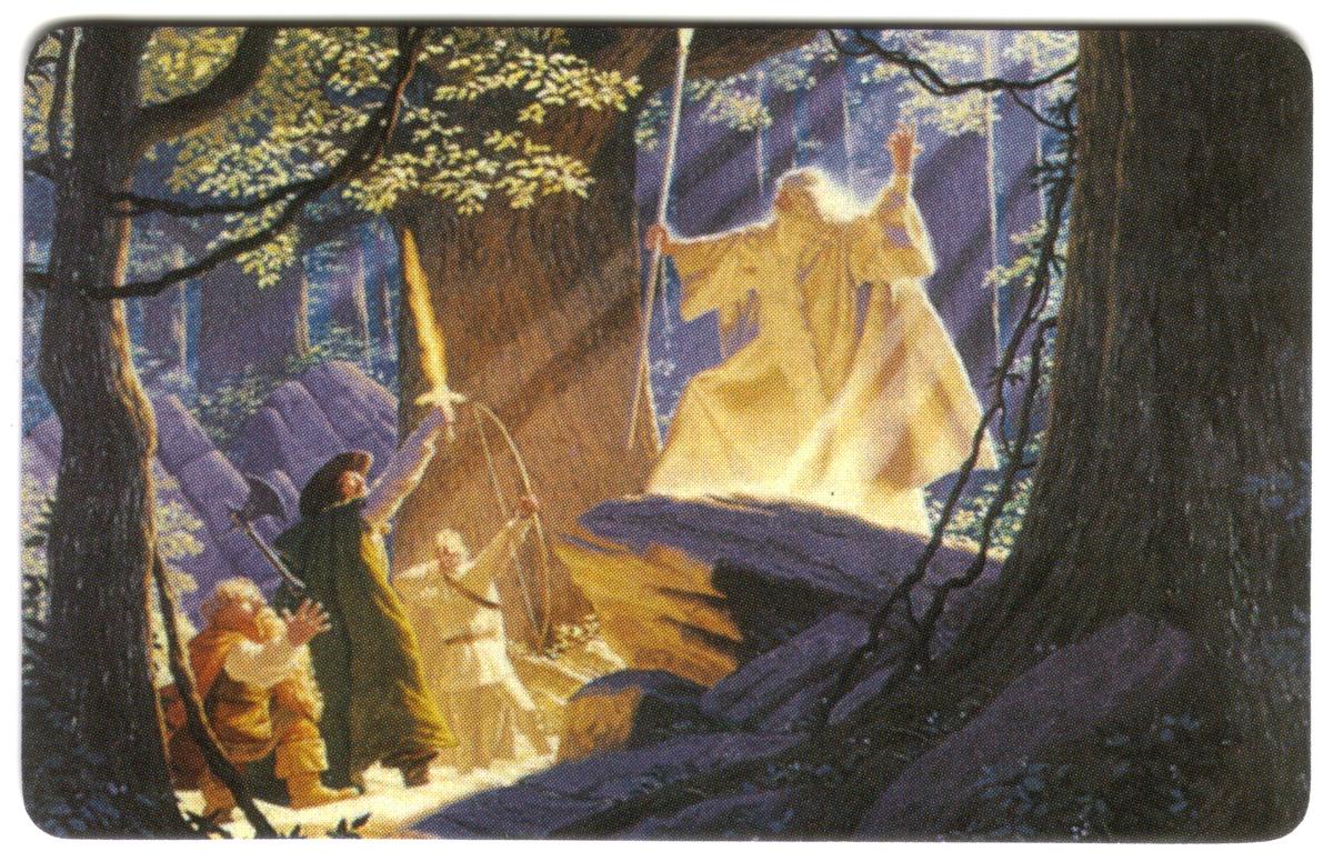 The second phone card depicts a dramatic moment in a wooded landscape where an elderly figure with a long white beard, dressed in white robes and holding a staff, raises his arm as three other characters stand before him. One holds up a glowing sword, illuminating the surrounding trees and rocky terrain, suggesting a moment of magic or confrontation.