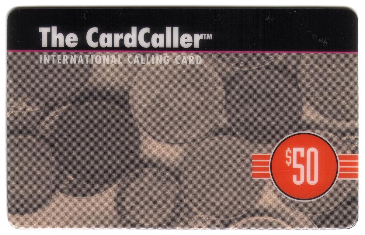 The card includes the name "CardCaller, Inc." printed on it, identifying the issuing or producing entity. The design is clean with no characters or intricate imagery other than the text and currency-themed elements. The concise layout highlights the "$50" denomination and the theme of world currency clearly.