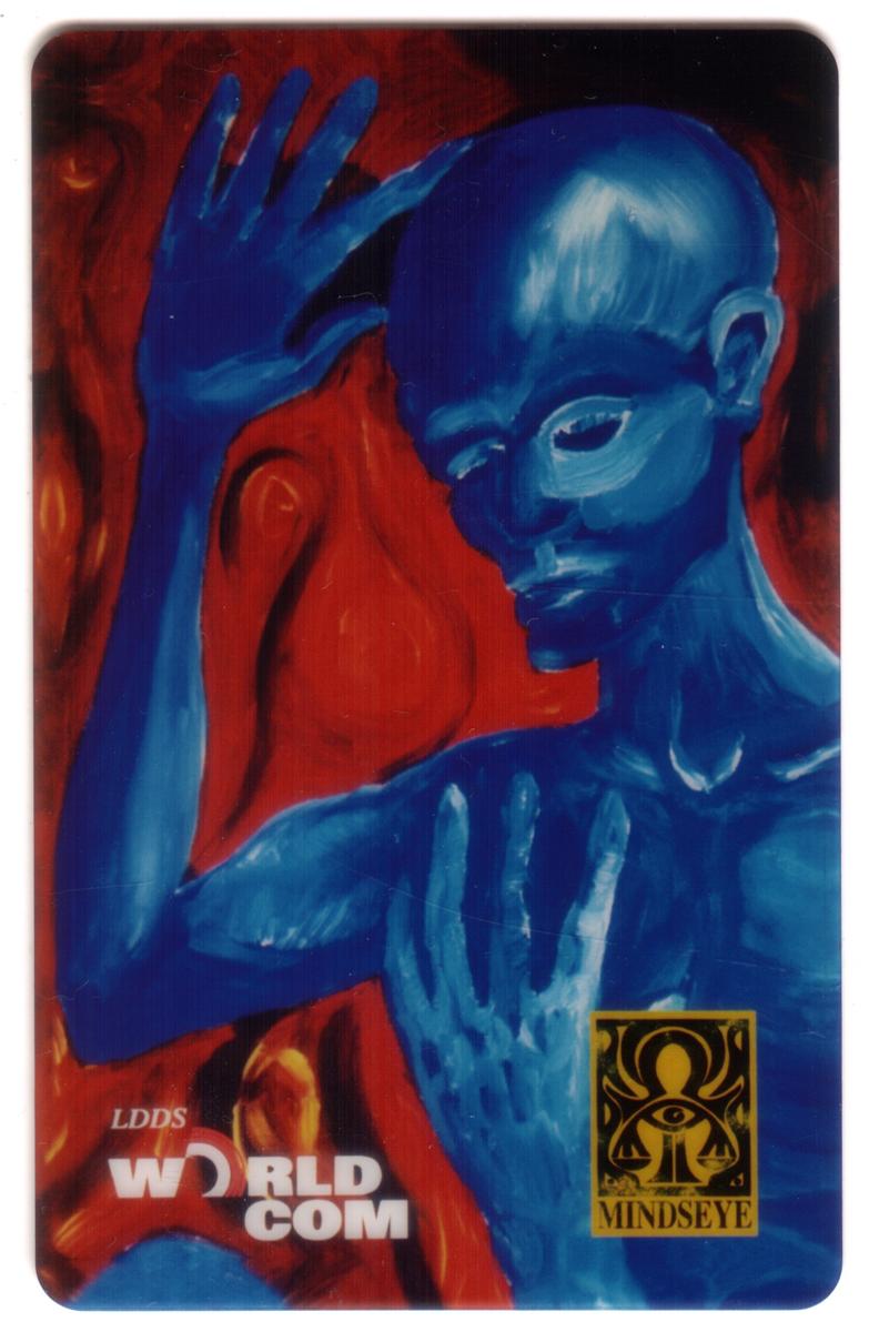 Text elements on the phone card include "10u MindsEye" and "LDDS WorldCom," establishing the creative source and organizational affiliation. The word “WorldCom” is presented as one word, and the font style used is clean and modern, supporting the card’s contemporary and visionary feel. This collectible phone card emphasizes artistic expression and mental imagery, making it a distinctive piece within collectible phone card series that focus on abstract and alien-themed artwork.