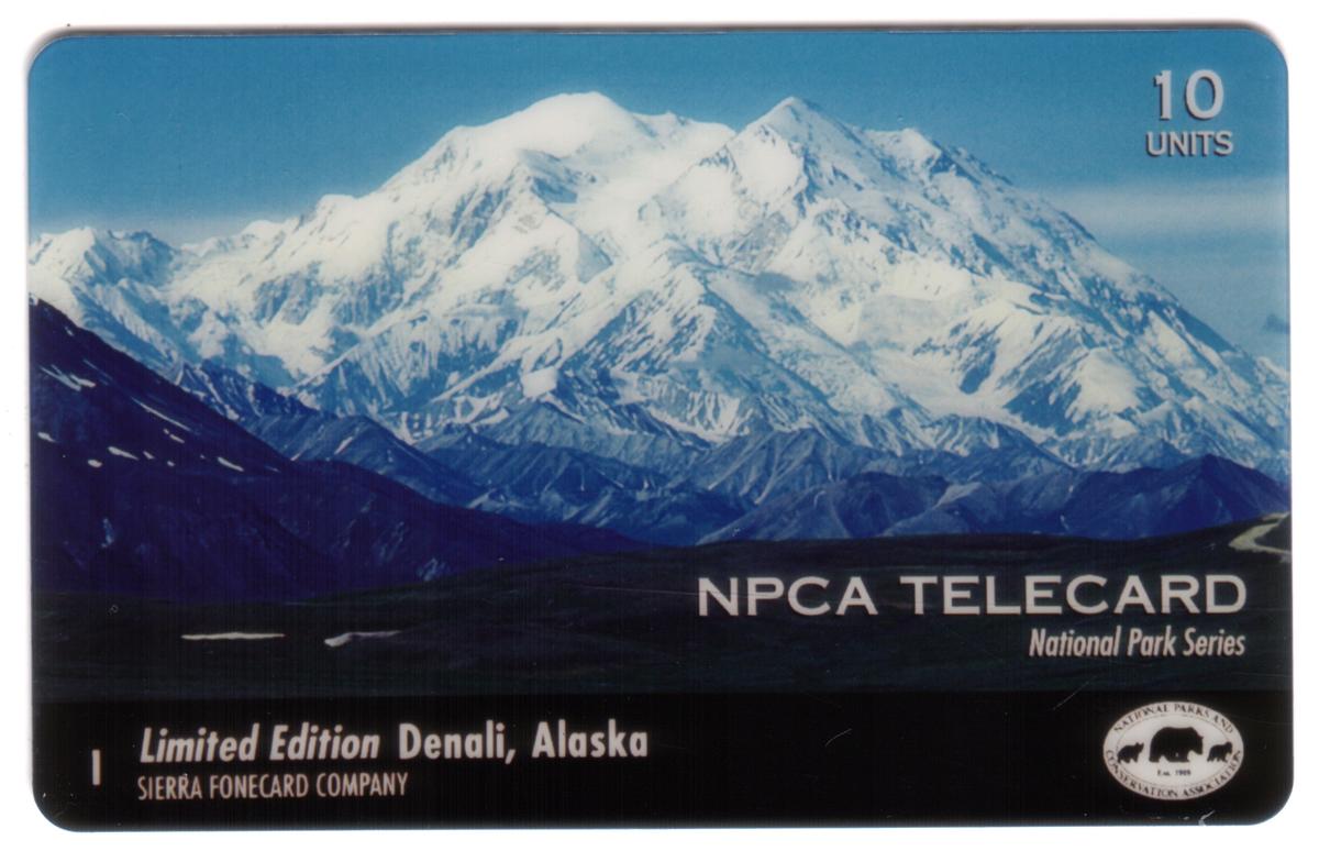 The card is labeled “NPCA Telecard” identifying it as part of the National Park Series. It includes the text “Limited Edition Denali, Alaska” along the bottom, along with the issuer name, Sierra Fonecard Company. The National Parks and Conservation Association (NPCA) logo appears on the lower right corner, signifying support for nature conservations and preservation efforts.