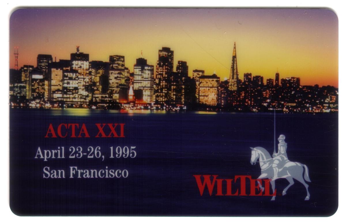 This collectible phone card features a vivid photographic image of the San Francisco skyline with the Transamerica Tower prominently displayed. The setting shows the cityscape in broad daylight beneath a clear sky. The card also highlights the WorldCom Wiltel logo along with the inscription "20u LDDS / WilTel - ACTA XXI Show 04/95," indicating its issuance tied to the ACTA XXI event in April 1995.