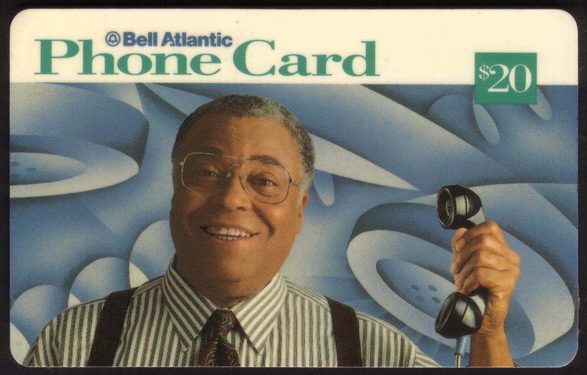 This promotional phone card emphasizes the connection between the iconic voice and presence of James Earl Jones with the Bell Atlantic brand, linking telecommunications with a recognizable celebrity. The card’s overall layout places the image slightly off-center, with James Earl Jones appearing in formal attire, including a tie and suspenders. The Bell Atlantic name is printed clearly, contributing to the card’s corporate and marketing theme.
