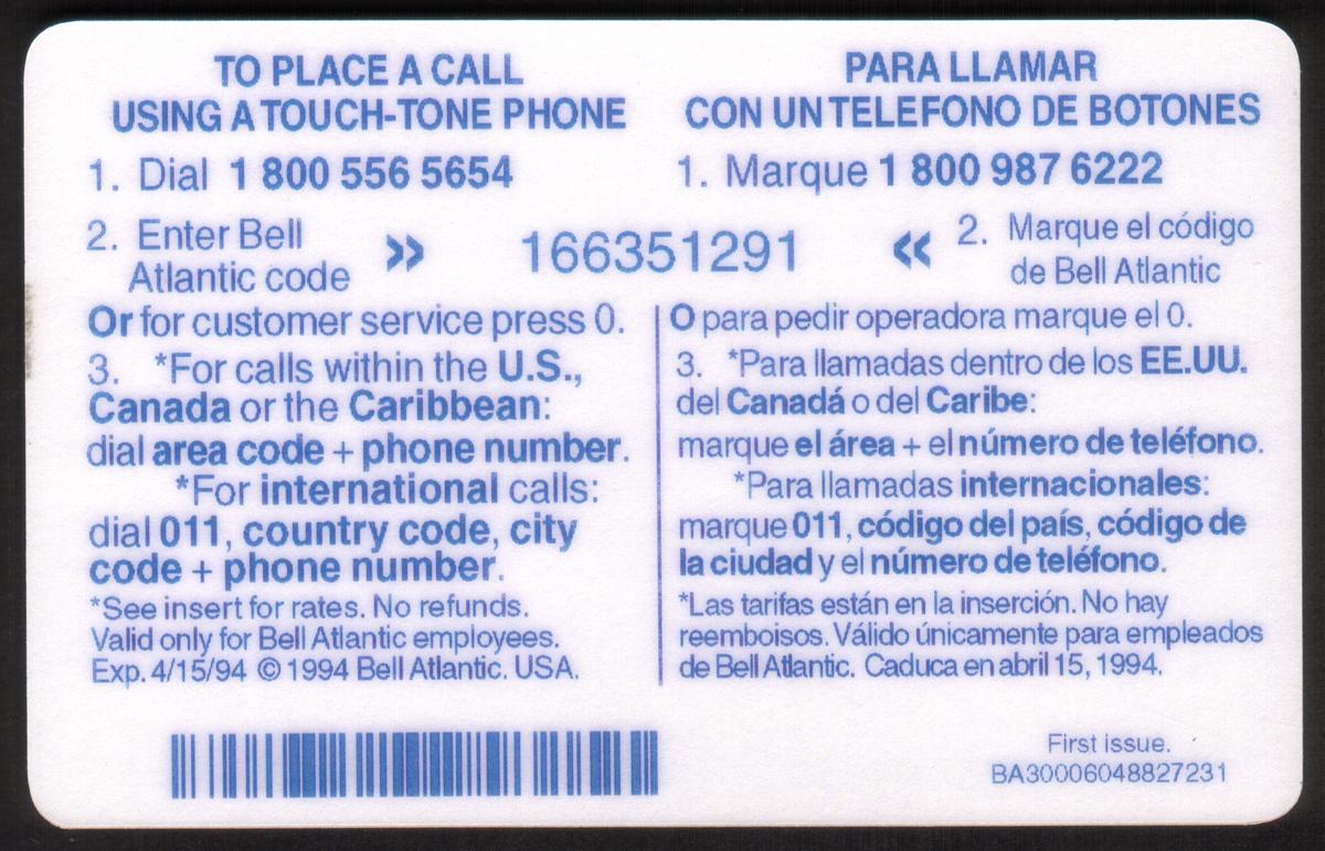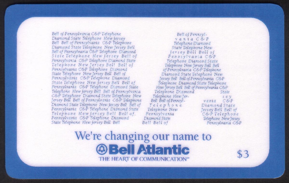 This phone card is bilingual, featuring English and Spanish languages, and relates to the corporate rebranding of Bell Atlantic. It is a $3 test card issued by Bell Atlantic.