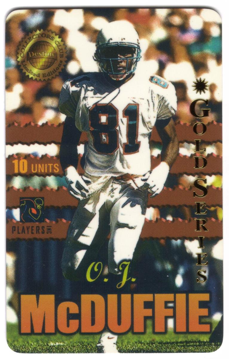 Overall, the card combines elements of sports memorabilia with collectible phone card features, presenting O.J. McDuffie as the key figure and celebrating his role as a Miami Dolphins wide receiver within the context of NFL football history.
