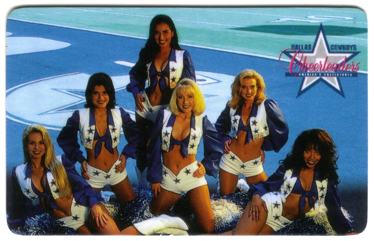 One card displays a single cheerleader posing confidently with long blonde hair, while others include a group photo of seven cheerleaders positioned together on the field in a dynamic arrangement. The cards capture the energy and spirit of the team, emphasizing their connection to Dallas, Texas, and their status as American sports icons. The professional photography captures vibrant colors and details, focusing on the cheerleaders and their uniforms.
