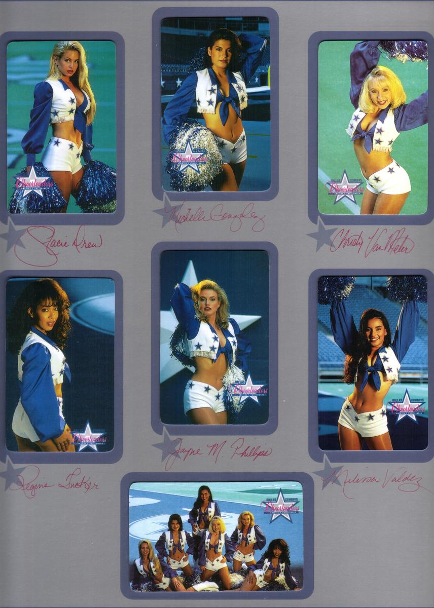 Each card within the set captures distinct poses and images of the cheerleaders, featuring bright, clear photography primarily in outdoor and stadium-like settings consistent with football culture. The imagery celebrates the cheerleaders’ role as American sports icons, merging athleticism and performance artistry. This collection appeals to enthusiasts of football, Dallas Cowboys memorabilia, and those interested in the cultural phenomenon of NFL cheer squads.